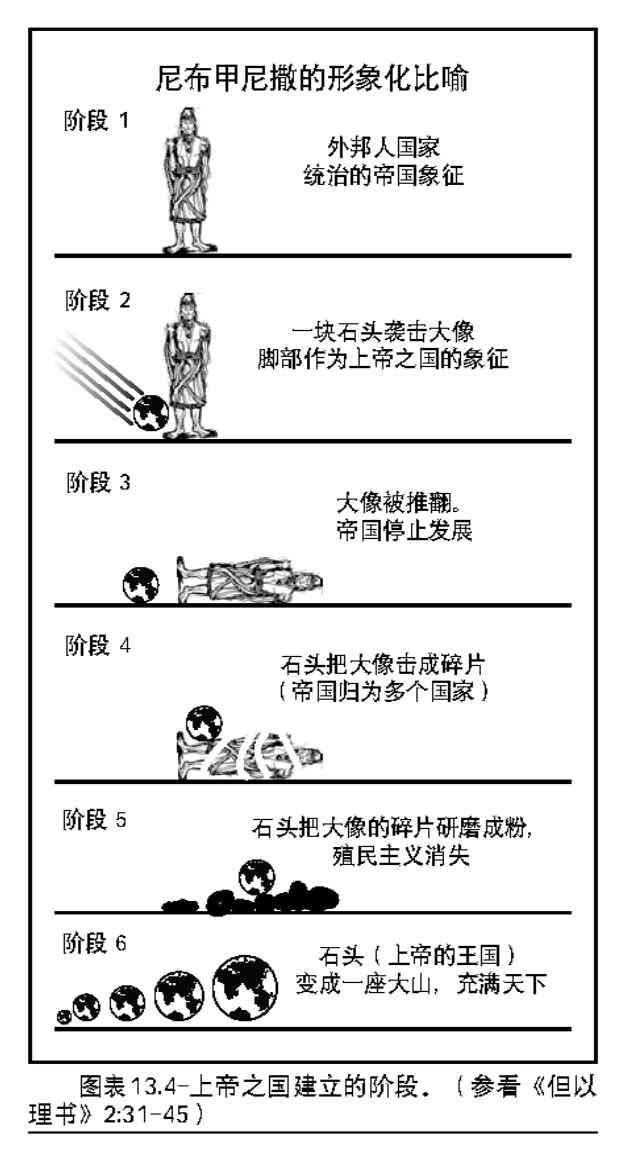 在這石頭正要被鑿出的這段期間是它的準備階段,但以它未來的命運看來,可以稱為是大山的雛形;教會也會如此,它被稱為上帝的國。然而事實上,那石頭在重擊大像之前並沒有形成大山;總而言之,當“主的日子”、即“憤怒降臨到萬族的日子”、或者“患難時期”將過去的時候,當教會被建立起來,而且所有其他的統治者都屈從於它的時候,教會將變成王國,充滿天下。 現在,要記住我們的主對基督教會中的得勝者作出的應許:“得勝的,我要賜他在我寶座上與我同坐”,“那得勝又遵守我命令到底的,我要賜給他權柄制伏列國。他必用鐵杖轄管他們(轄管原文作牧),將他們如同窯戶的瓦器打得粉碎。像我從我父領受的權柄一樣。”(《啟示錄》3:21; 2:26,27; 《詩篇》2:8-12)當鐵杖完成了毀滅的工作,擊打之手將變成醫治之手,人民將歸向耶和華,他將治癒他們(參看《以賽亞書》19:22; 《耶利米書》3:22, 23; 《何西阿書》6:1; 14:4; 《以賽亞書》2:3),賜華冠與他們代替灰塵,喜樂油代替悲哀,讚美衣代替憂傷之靈。 |