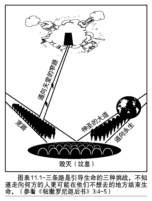 通向毀滅的寬路 對於墮落的人類來說,這條通向毀滅的寬路是最容易走的,因此稱之為寬路。六千年前,亞當(他是人類的代表)如同一個罪人被定罪而走向毀滅,開始了這條道路,九百三十年後他走到了這條路的終點 — 毀滅(死亡)。隨著數個世紀的流逝,這條向下墮落的道路磨得越來越光滑,人類也越來越快地走向毀滅,由於罪,這條道路一天天地變得更光亮、更粘滑,使人很容易摔倒。不僅這條道路變得更光滑,而且人類也每天都在失去生命的抵抗力,因此現在人類平均壽命大約是三十五歲。人們現在到達了這條路的盡頭 — 毀滅,與第一個人相比之下快了九百年。 |